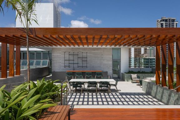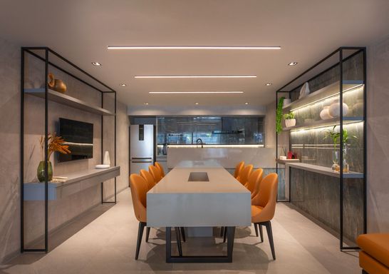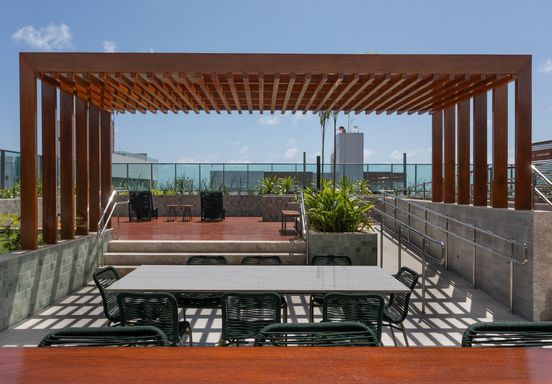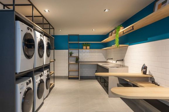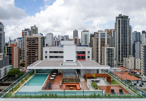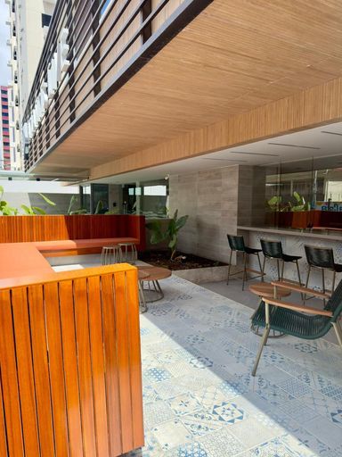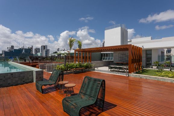 Pilotis com áreas de apoio e lazer integrados: Recepção e controle com barreira, guarda entregas, espelho D´agua, Coworking com sala de reuniões, megalounge/salão de festas, Espaço do chef, Lounge Externo com Bar, Brinquedoteca, lavanderia e Passadoria, Sala Administrativa e Vestuário para Funcionários.