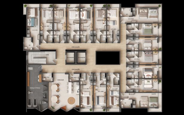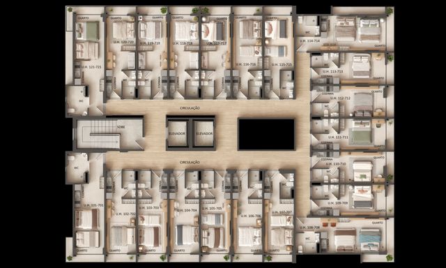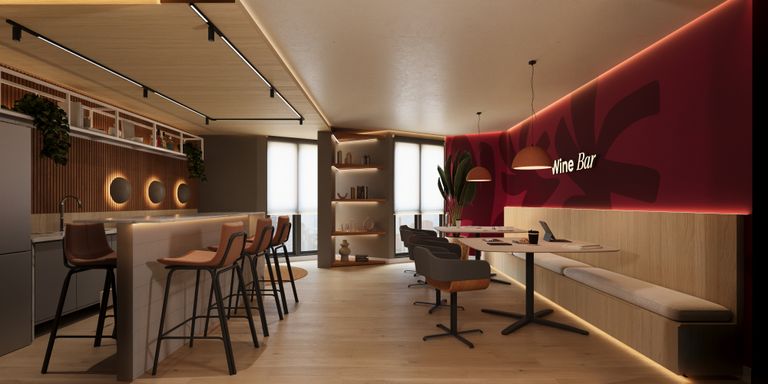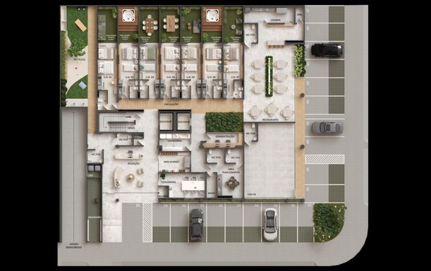 * Terreo com minimarket, restaurante, loja, unidades garden, lavanderia compartilhada, coworking, administração, espaço delivery