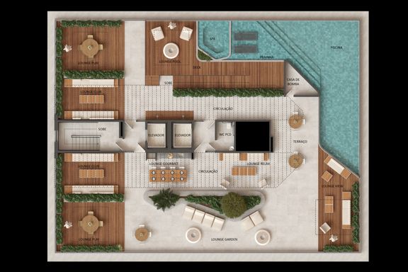 * Cobertura com louge Play, lounge Club, lounge gorumet, Lounge relax, lounge poolterraço, picina com borda, prainha, spa e deck.