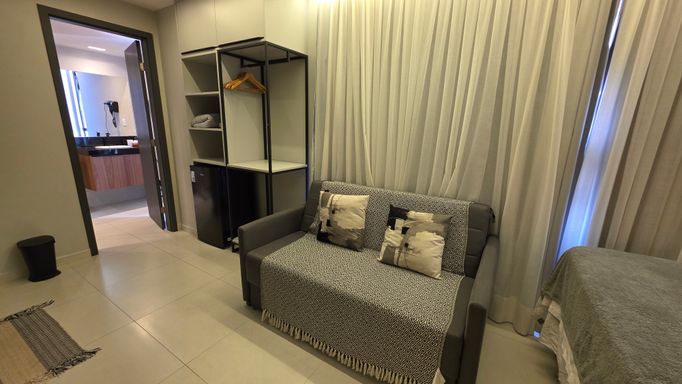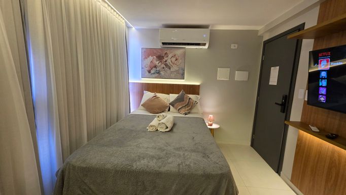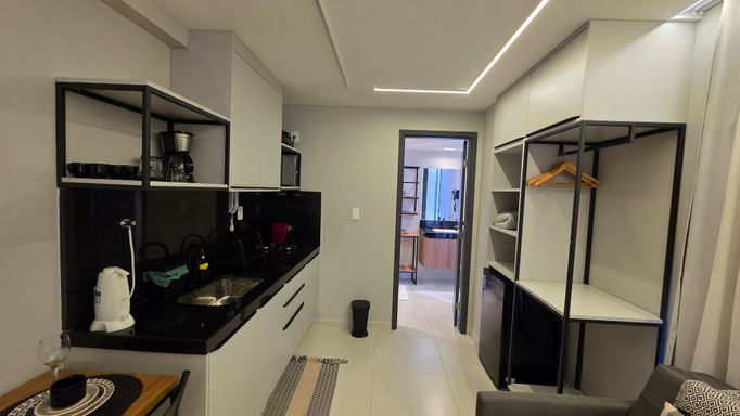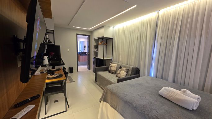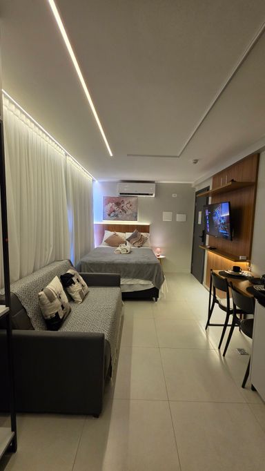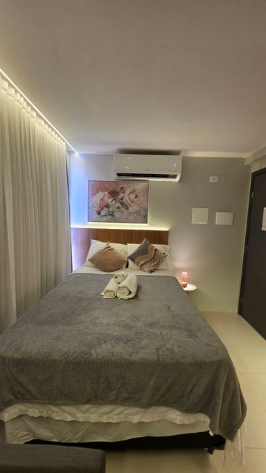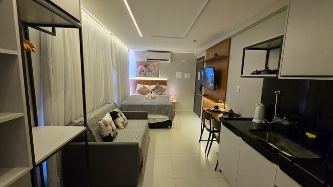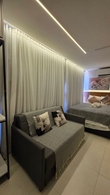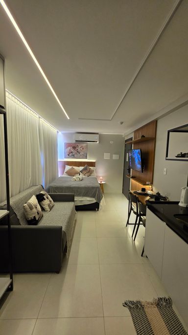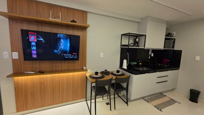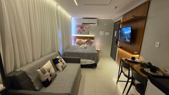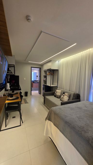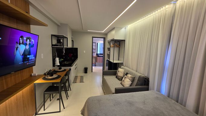 A VIVI IMÓVEIS (CRECI 0718J) Vende um lindo apartamento estilo flat, todo mobiliado e projetado, tudo de bom gosto e alto padrão, prontopara rentabilizar. O flat conta com 23 m² de área, Quarto, Sala, Cozinha e Banheiro. Vaga de garagem rotativa, Portaria com reconhecimento fácil e senha, Portaria 24h em período de alta. Cama de casal baú, Sofá cama, Mesa com cadeiras, TV, Eletrodomésticos, Enxoval, ar condicionado e utensílios de cozinha e banheiro.